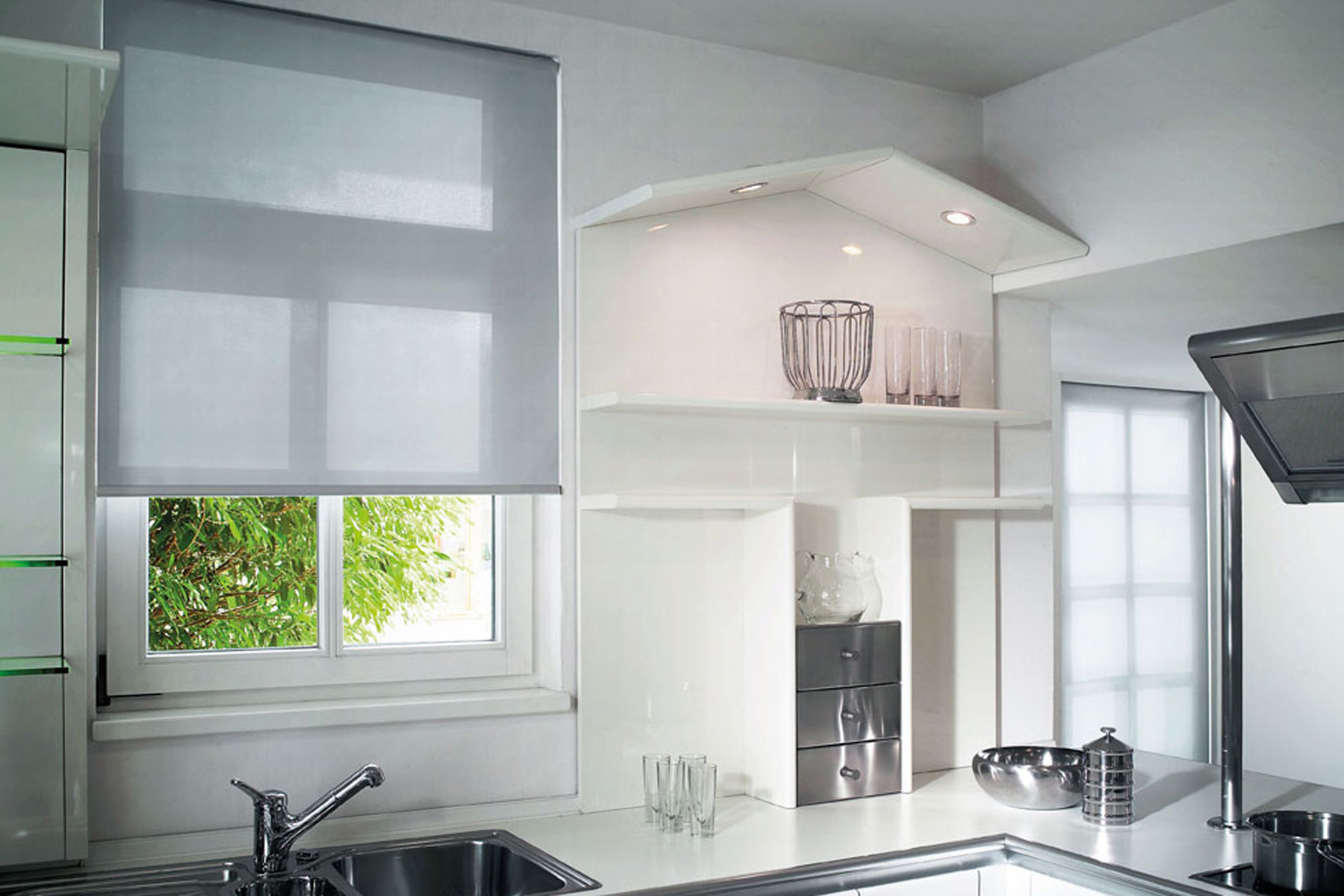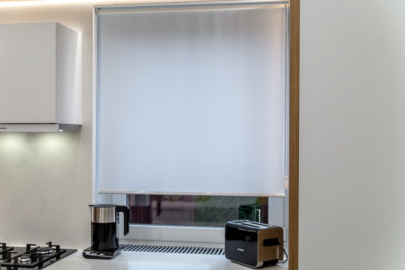Rolgordijnen beschermen perfect tegen fel zonlicht, maar maken de keuken niet te somber.