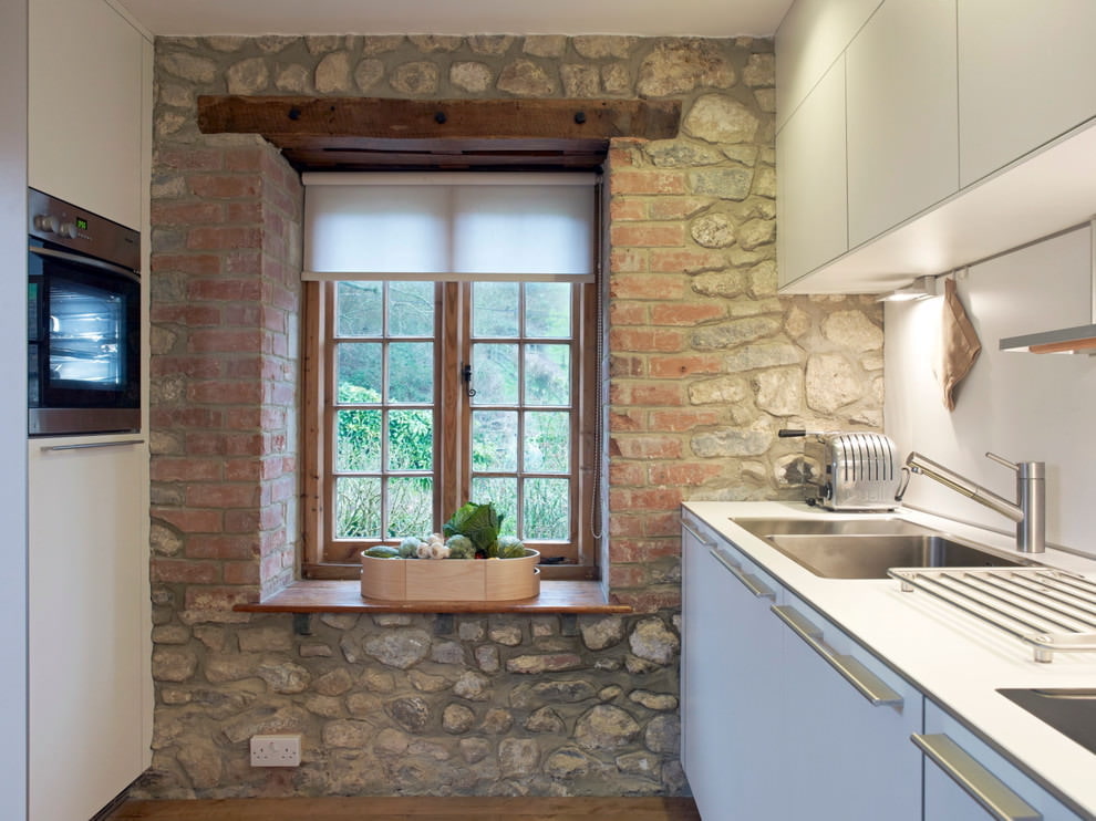 Moderne trends in het interieur adviseren om eenvoud en strengheid te combineren in het ontwerp van de raamzone in de keuken.
