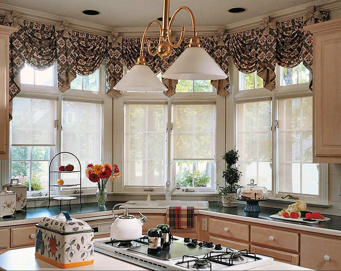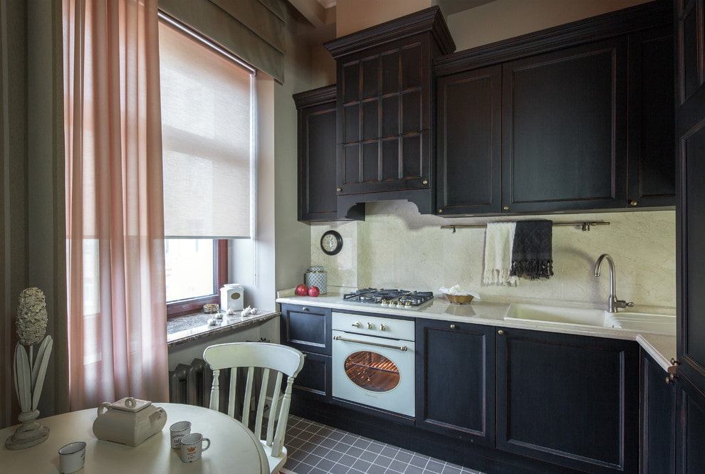 Om de keuken er harmonieus en stijlvol uit te laten zien, moet niet alleen rekening worden gehouden met de schaduw van de gordijnen, maar ook met de vorm en de grootte.