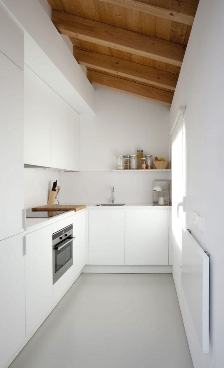 Verschillende opties zijn beschikbaar - pleisterwerk, houten lambrisering of het creëren van een verlaagd plafond. De laatste optie past niet goed in de keuken.