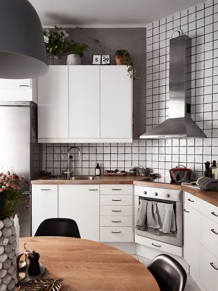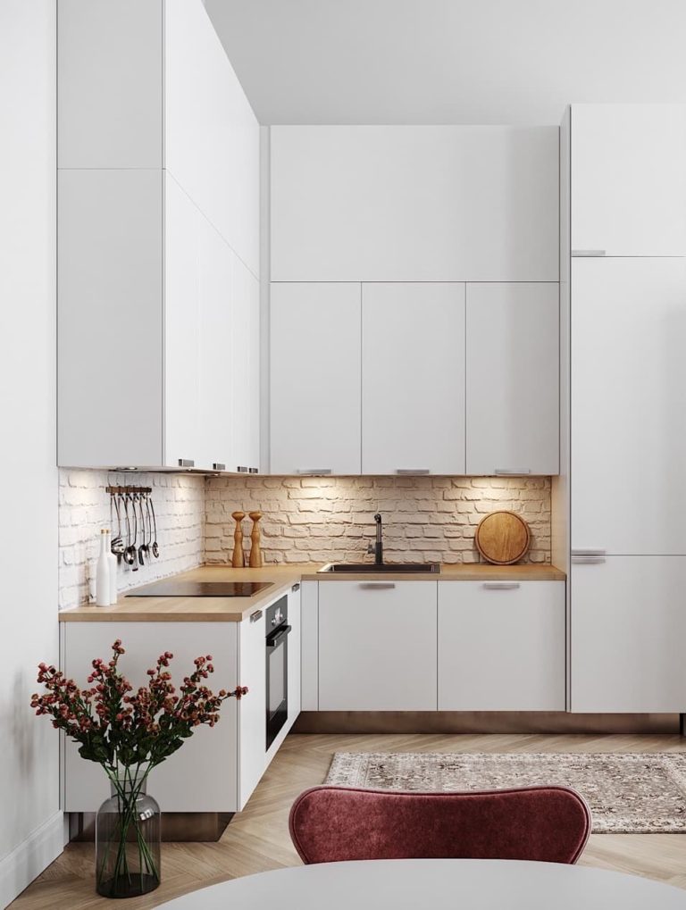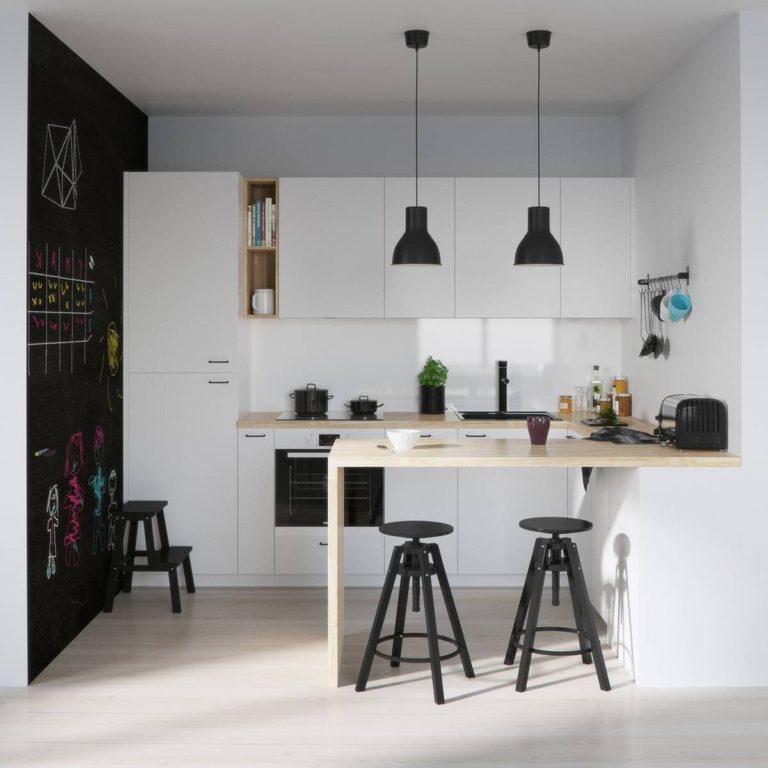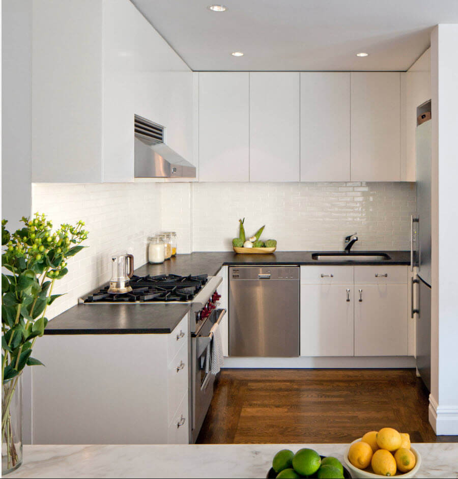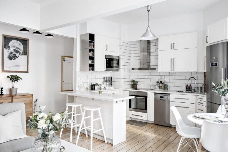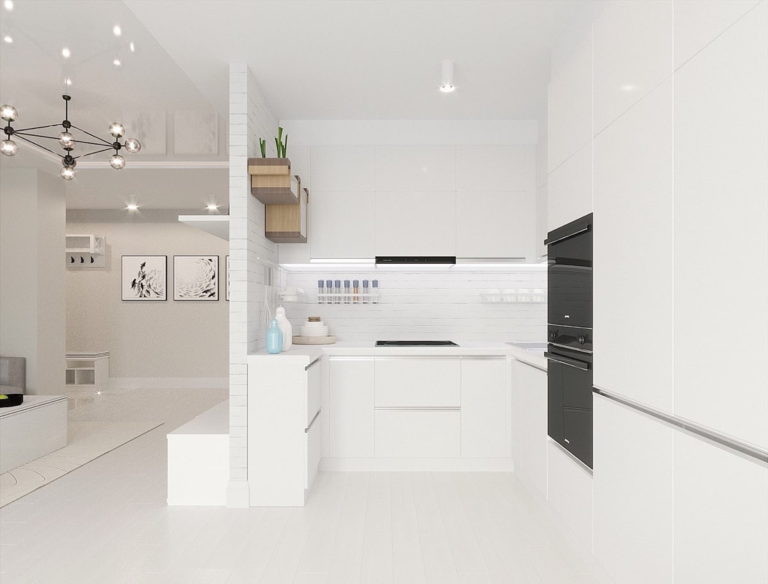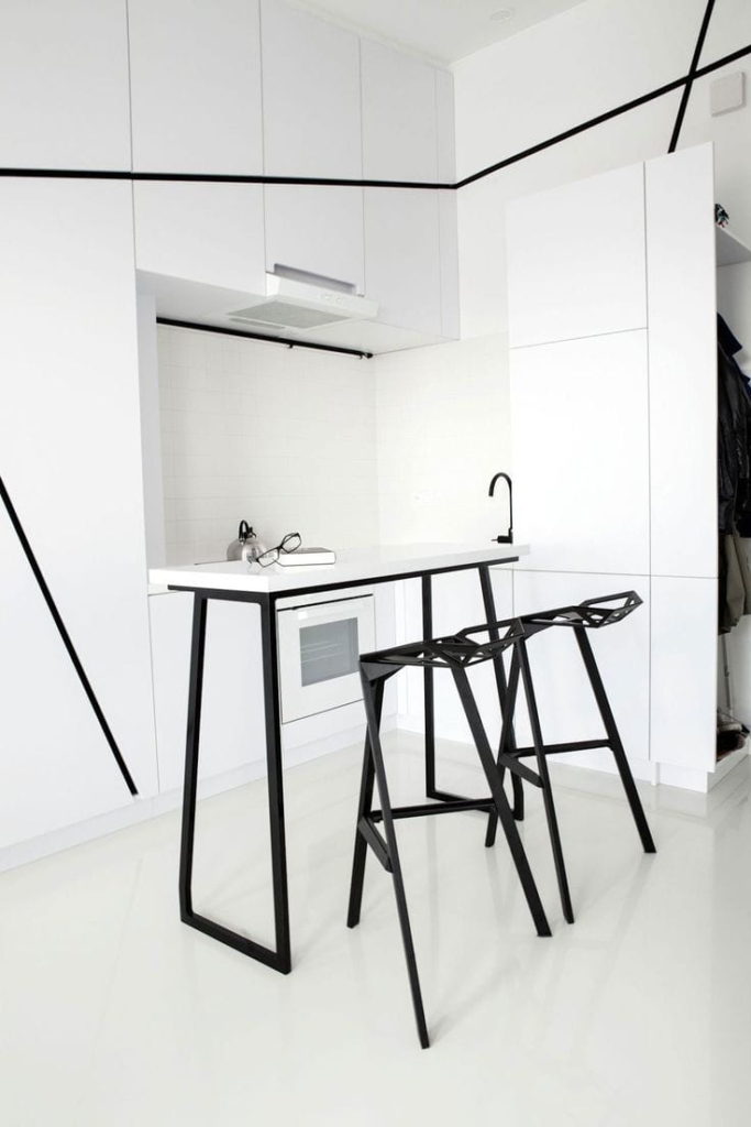 Zwart-wit combinatie wordt als modieus beschouwd, maar probeer minimaal zwart te gebruiken, alleen in decoratie. Zwart verkleint visueel het beschikbare gebied.