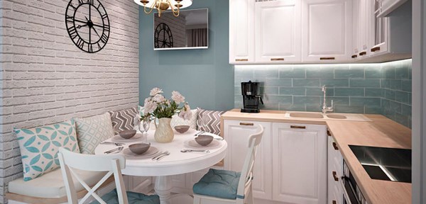 Helaas past de modieuze loft nu niet in een kleine ruimte. Maar zulke mooie richtingen als modern, Provence, minimalisme, land passen erin. Om een Provence-omgeving te creëren, pak een licht palet, vliegende, lichtgewicht stoffen als u van plan bent om gordijnen op te hangen. Geschikte patronen in de vorm van bloemen of tegels die licht metselwerk nabootsen.