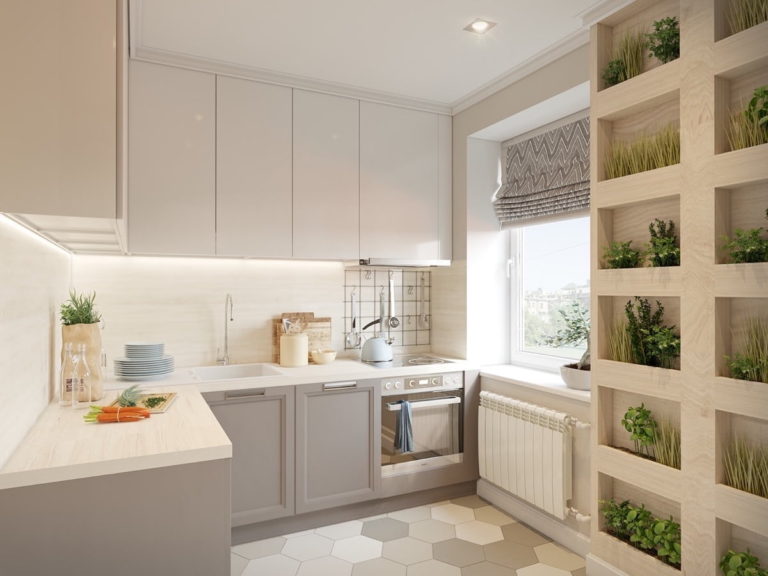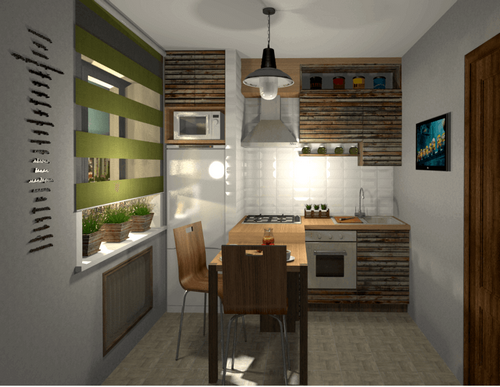 In Chroesjtsjov doen keukens vaak meer denken aan pantry's, maar zelfs in een vierkant van zes meter kun je echt alles plaatsen wat je nodig hebt. Plaats bijvoorbeeld de kookruimte in plaats van de vensterbank en kies een handig werkblad. Verbind het met een extra oppervlak dat vloeiend overgaat in de gootsteen en tegel.
