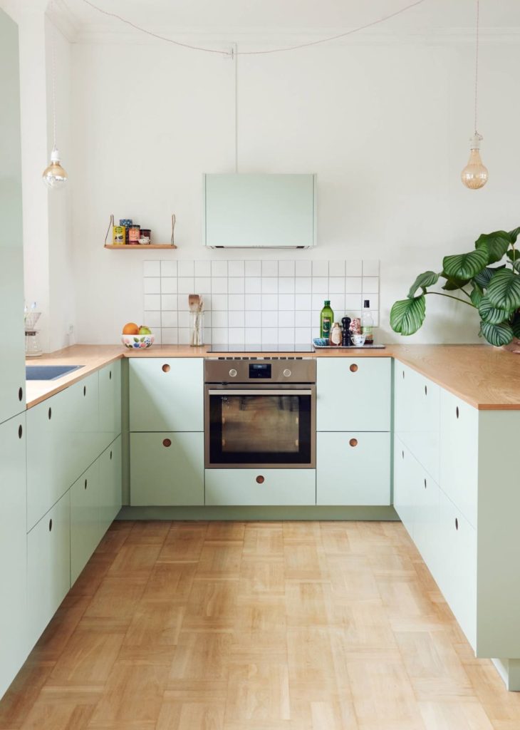 Pistache in combinatie met elke lichte tint, variërend van crème en beige, creëert een verfijnde, delicate keuken. Uiterlijk lijkt op de Provence, het is licht van gewicht, heeft een positief effect op de psyche.