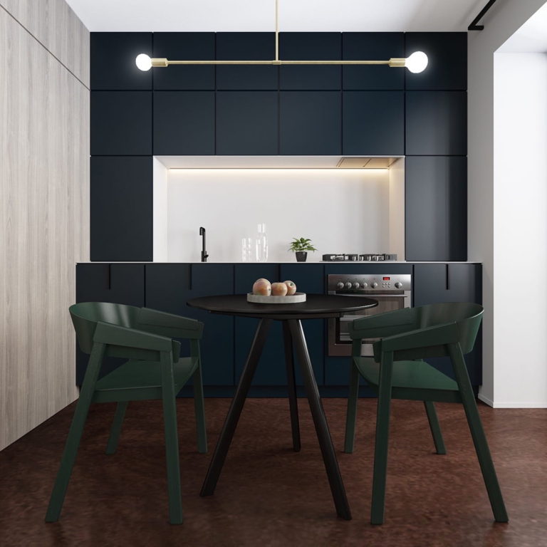 Vergeet niet, zelfs als op het hoogtepunt van populariteit een donkere kleur, gebruik het niet in kleine kamers. Donkere tonen verminderen visueel de ruimte, waardoor deze nog meer gecomprimeerd wordt.