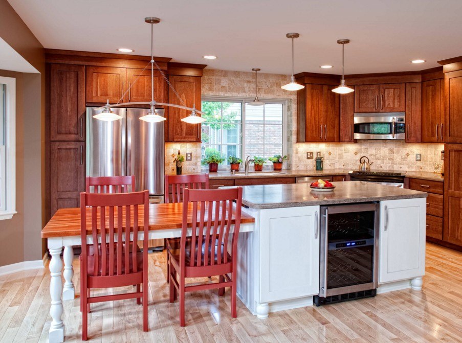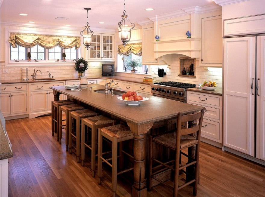 Het eilanddeel vervult drie functies tegelijkertijd. Het dient om te koken, te eten en past ook perfect bij het interieur. Als u een gecombineerd aanrecht maakt, kunt u een tafel en een bar op één eiland combineren.