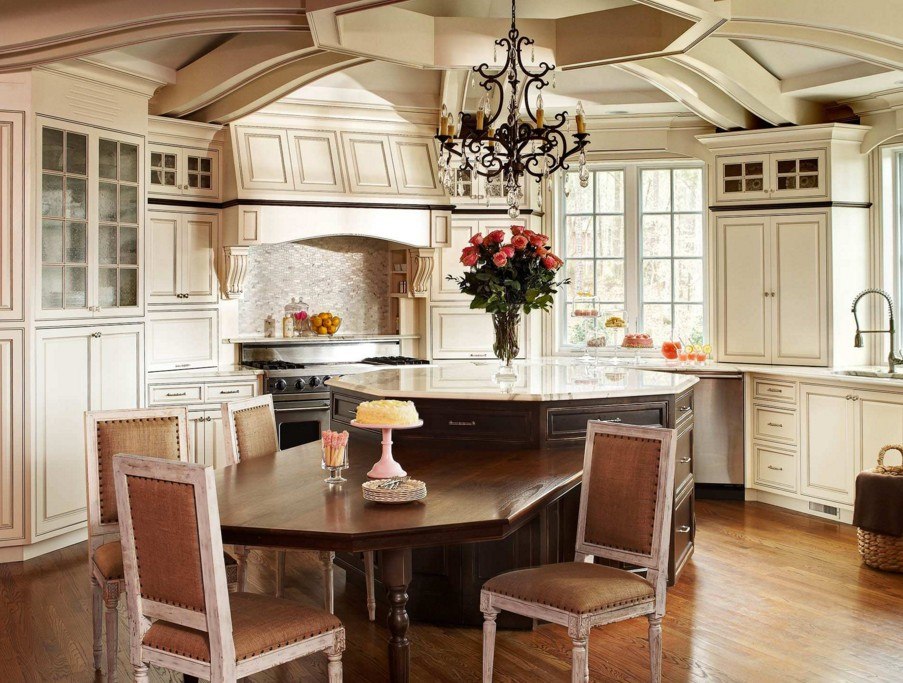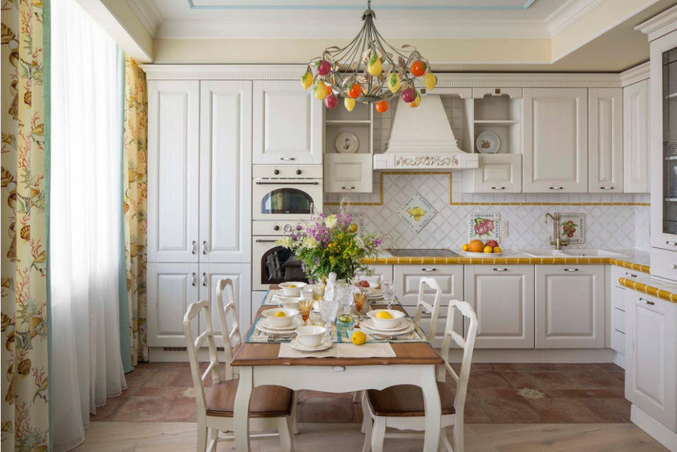 De keuken is een plaats van kracht. Hier zou de sfeer elk lid van het gezin moeten laten ontspannen. Als je moe bent op je werk, wordt het sterker hier voor de volgende dag. De inrichting van het interieur draagt hieraan bij. Door de nodige kleinigheden te selecteren, het effect van een sprookje, wordt een luchtspiegeling gecreëerd.