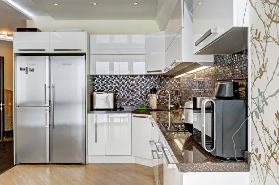 Versier je hi-tech stijl kookruimte. Dit is een moderne en zeer populaire manier om het interieur van een kleine kamer te versieren. En de glanzende oppervlakken die op deze manier inherent zijn, zullen het effect geven van het vergroten van de kwadratuur (natuurlijk visueel).
