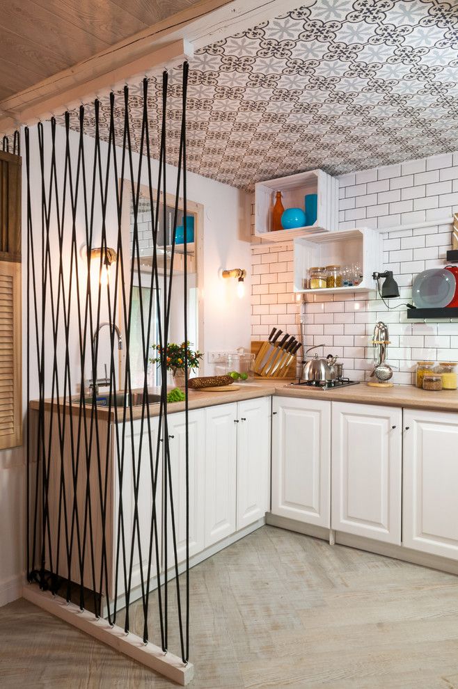 Als decoratieve componenten, ongebruikelijke gerechten, een headset op het aanrecht, harmonieus opgehangen schilderijen aan de muren, zullen familiefoto's en andere elementen zeer succesvol dienen. Vergeet de zonering niet. Dit is een geweldige manier om ruimte te transformeren.