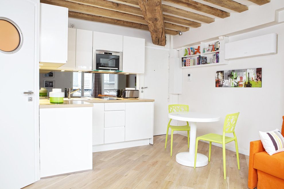 Gelegen langs de aangrenzende muren van de suites, is de "werkende driehoek" van de keuken ideaal geplaatst - een fornuis, gootsteen en koelkast