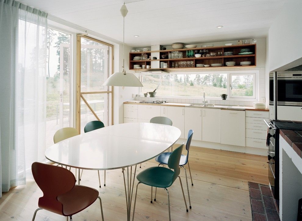 Het eetgedeelte bevindt zich in het midden van de keuken. De tafel is in het wit gekocht. Het glanzende oppervlak is hier al geschikt. Eetkamerstoelen worden ook wit gekocht. Deze tint is het gezicht en de fundamentele component van het "Scandinavische" motief.