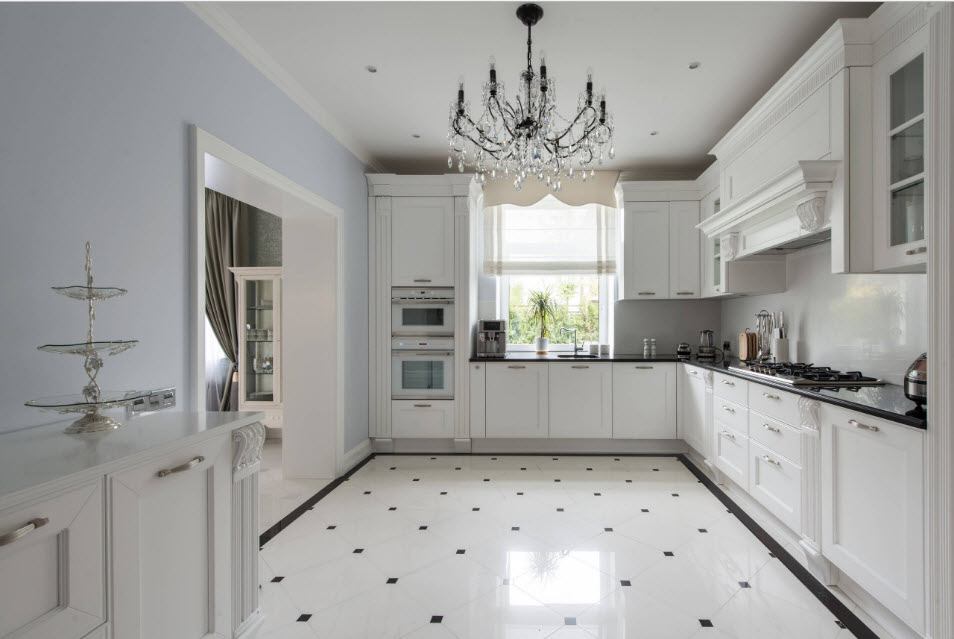 Het plafond is op twee niveaus ingesteld. Het is geverfd met witte verf. De locatie van de niveaus is klassiek. Dit betekent dat er aan de randen van de muren een richel dichter bij de vloer zal zijn. Maar in het midden, integendeel, is er een verdieping. De vorm van de niveaus hoeft niet standaard rechthoekig te zijn. Ongewone, ingewikkelde vormen zijn welkom. Bovendien moet kunstmatige verlichting op het plafond worden geplaatst. Plaats de armaturen rond de omtrek in spot-design. De centrale kroonluchter moet een ander zicht hebben dan de randlichtbronnen. Dit zal de nadruk leggen op het plafond, de centrale zone markeren.