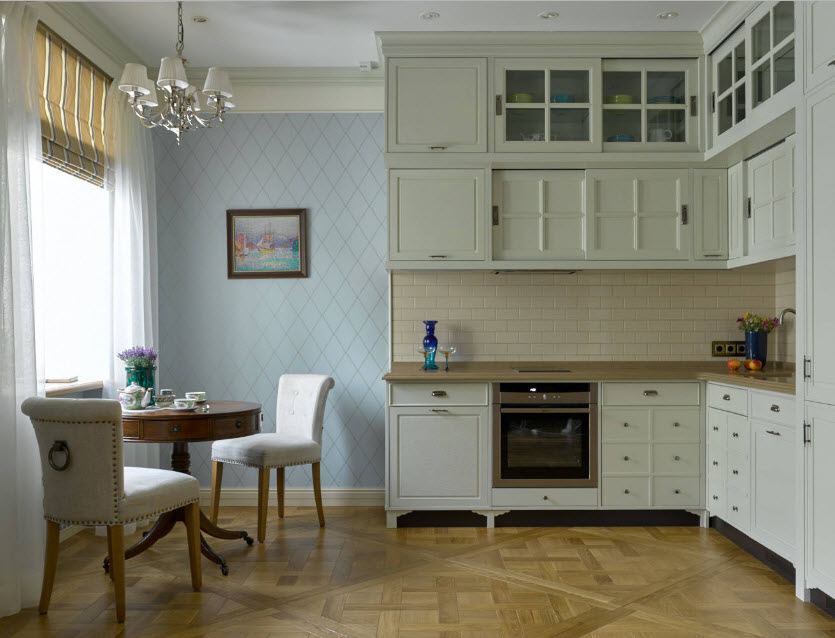 Het eetgedeelte in deze keuken is gemarkeerd met parket; in het werkgebied worden slijtvaste keramische tegels gebruikt
