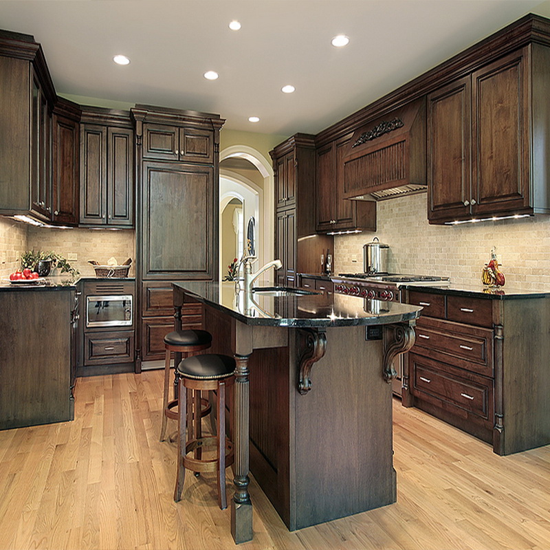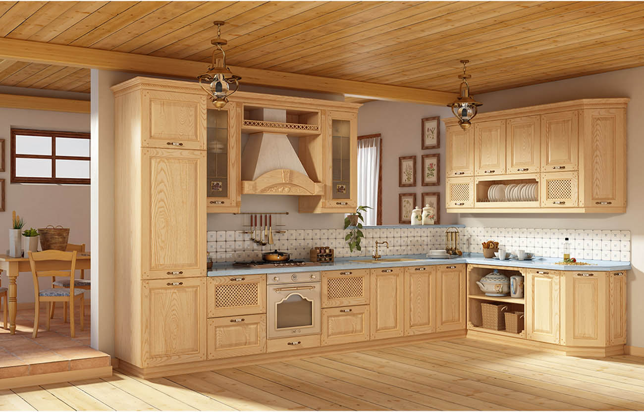 Country combineert alle rustieke stijlen van keukeninterieurontwerp in een appartement. Waaronder kunnen worden opgemerkt: Franse Provence, Alpenchalet, Toscaans, Engels.