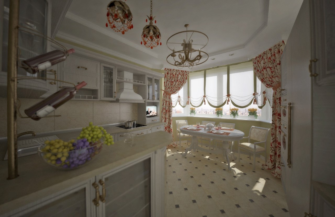 Moderne keukens op balkons zijn ingericht in bestaande interieurstijlen. Het verschijnt in exterieurdecoratie, decor, textiel, vloer- en wandbekleding. Omdat de gedeeltelijk verbonden kamer van de loggia nu wordt gecombineerd met de hoofdruimte, wordt dezelfde vloer op de vloer gelegd als in de keuken zelf. Het is verstandig om een gemeenschappelijk aanrecht te maken door een balk uit te voeren, waar ooit een venster was, van hetzelfde materiaal als de hele headset.