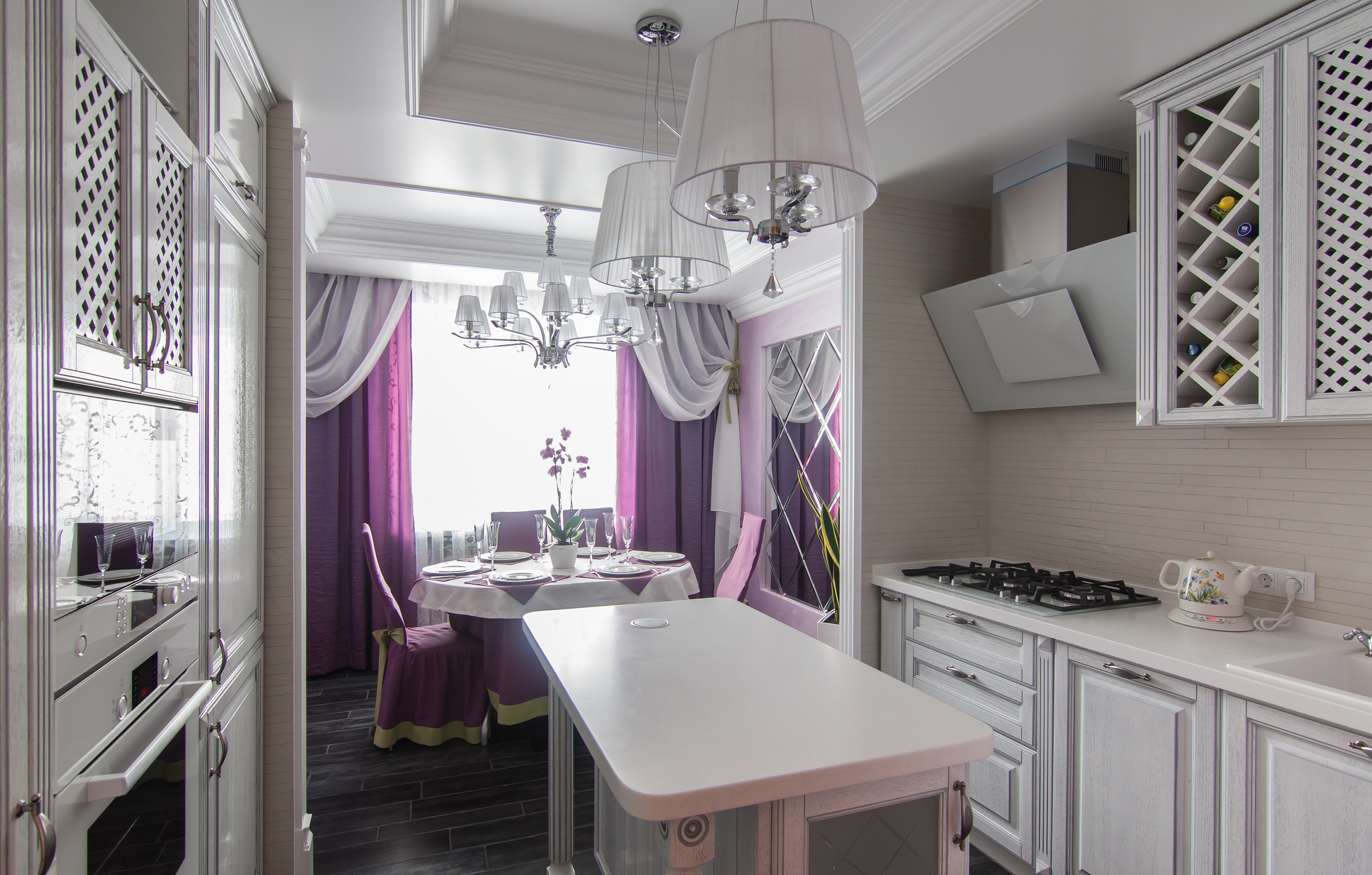 Buitensporig volumineuze gordijnen "op de vloer", opgehangen aan een dikke kroonlijst, versierd met veel volants, ruches, plooien, zijn ongepast. De kamer is vrij klein en de gordijnen "stelen" enkele tientallen centimeters bruikbare ruimte. De volledige afwezigheid van gordijnen, vooral op de eerste verdieping, is ook een slecht idee - iedereen die voorbij komt, zal zien hoe de eigenaren broodjes kauwen, aardappelen schillen, vlees snijden of ontspannen met een glas lokale wijn.