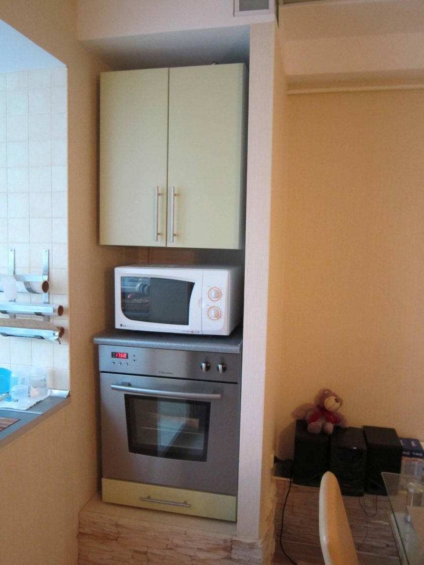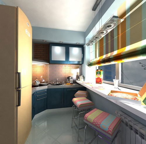 Keuken in een kleine studio, vaak gelegen op de loggia. Om dit te doen, alle benodigde communicatie "reiken", wordt een miniatuur-headset verworven. De vrijgekomen keukenruimte wordt een logeerkamer. Wanneer het gehele werkgebied naar de loggia wordt gebracht, wordt een staafteller, inclusief een L-vormige, op de plaats van de raamopening gemonteerd, evenals loodrecht daarop.