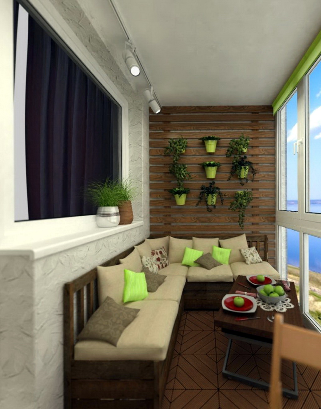 De loggia-meubels mogen het licht niet verdoezelen en alleen de lichtste objecten worden op het balkon geplaatst. Het past perfect in de eetkamer met een tafel, stoelen, een rotan serveertafel. Houten vouwopties zijn ook geschikt. De headset is gekoppeld zonder bovenkasten, maar metalen gaasplanken zijn acceptabel. De ingebouwde kast, inclusief de hoekkast, neemt hier niet veel ruimte in beslag, maar wordt soms ook aangevuld met een opvouwbaar, intrekbaar werkblad.