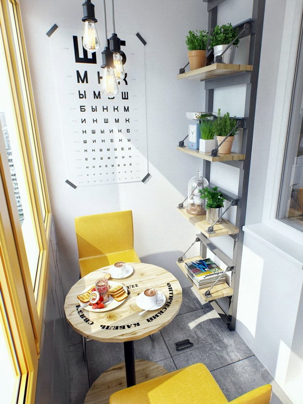 Het ontwerp van het balkon zal beter worden als in plaats van dikke wandkasten kleine planken met prachtig zichtbare gerechten gebruiken