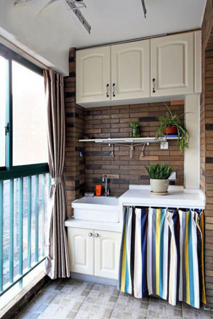 Als de balkon-loggia-zone ruim genoeg is, zetten ze, naast de meubelset, een compacte wasdroger op, een strijkplank, waarvoor er gewoon geen andere plaats was. Deze optie is vooral handig als er een wasmachine in de keuken staat.