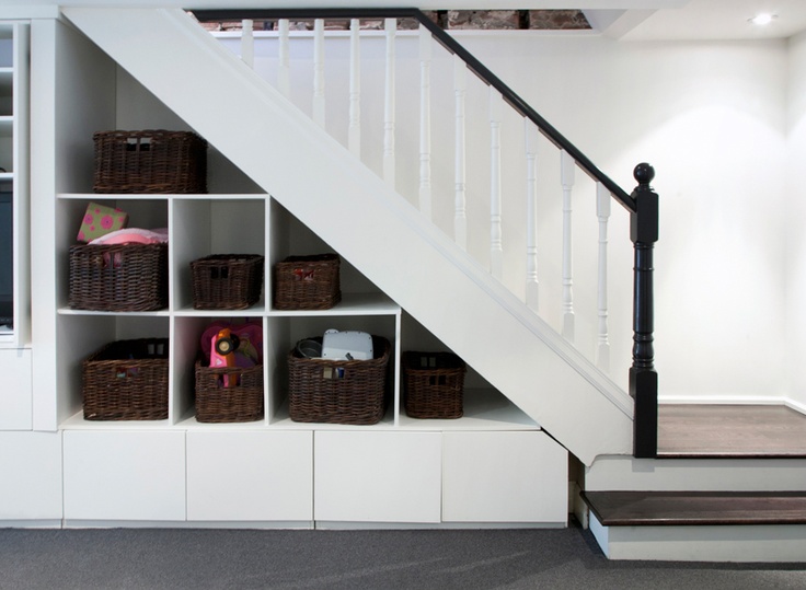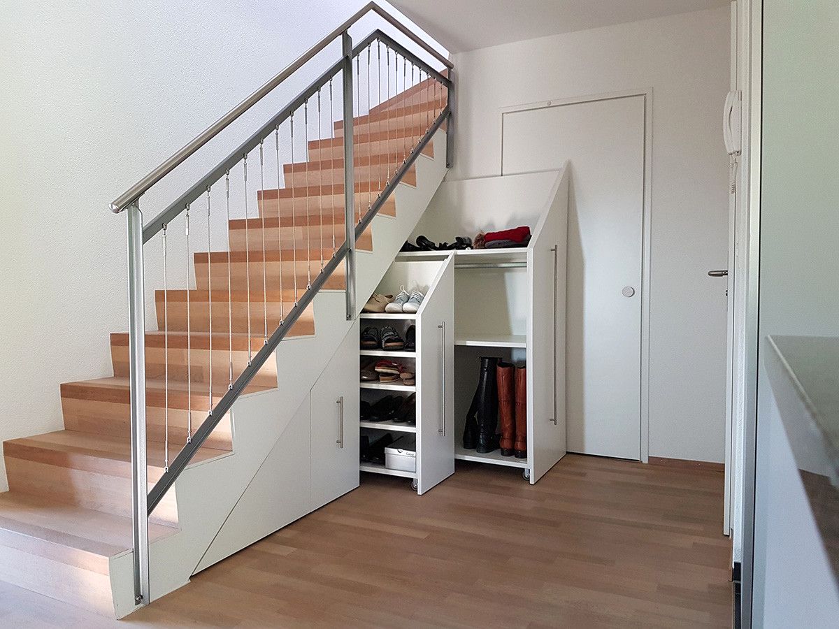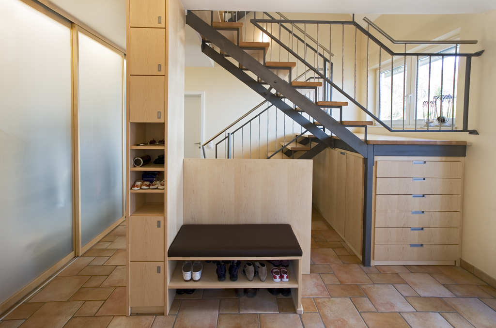 Selon l'endroit où se trouve l'escalier, les meubles encastrés peuvent être classés selon leur rôle dans la vie quotidienne de la famille.
