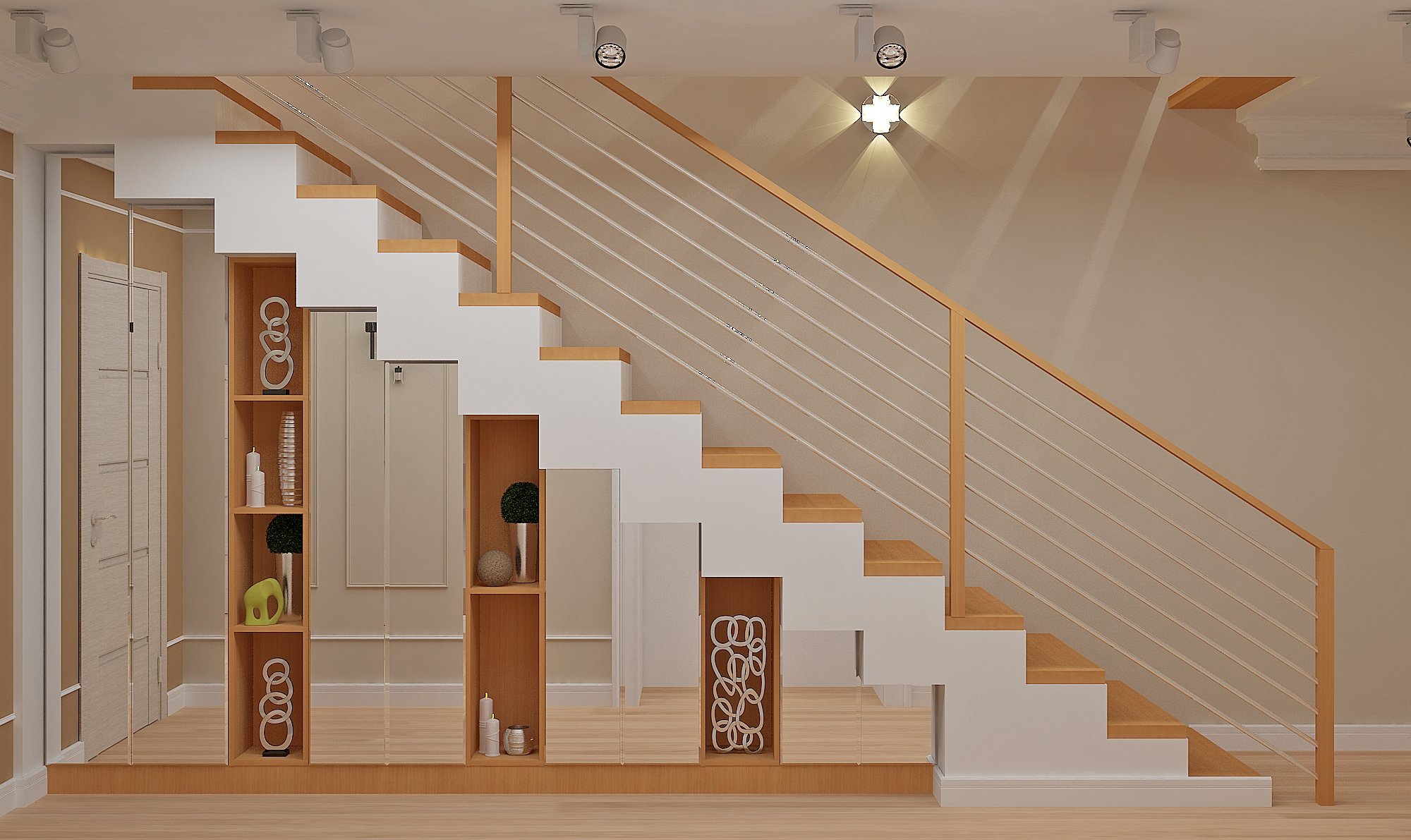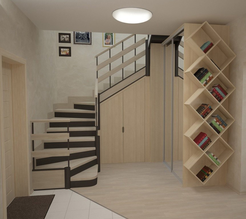 - Si l'escalier est modeste, peu visible, les structures intégrées ne devraient pas attirer l'attention. Leur tâche principale est d'être un espace de stockage volumineux derrière des portes closes.