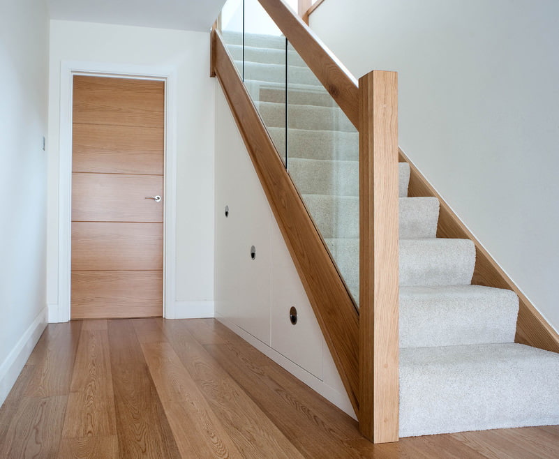 - L'armoire encastrée convient aux escaliers situés dans le hall et adjacents au mur. Il y a suffisamment d'espace pour un dressing ou de vastes armoires encastrées dans le couloir.