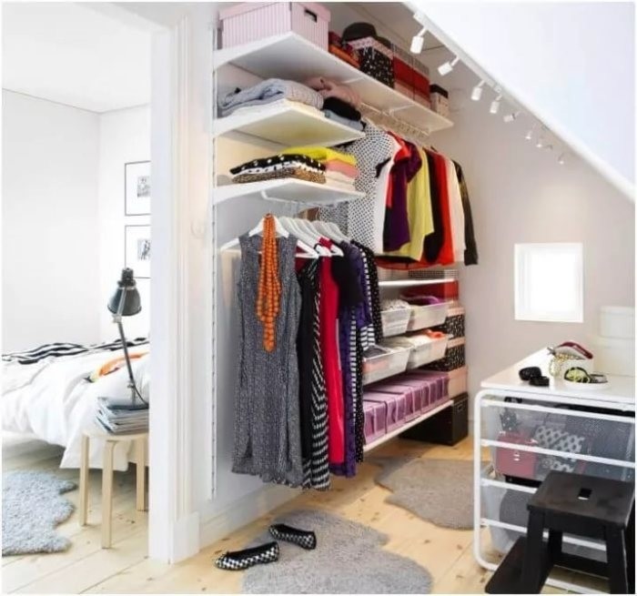 Dans le cas d'une petite pièce à vivre, un dressing modulaire ouvert peut être intégré sous l'escalier. Rien n'empêche la circulation de l'air, mais la poussière et l'humidité, ainsi que les odeurs animales, l'imprégnation des vêtements, ne seront pas un très bon bonus.