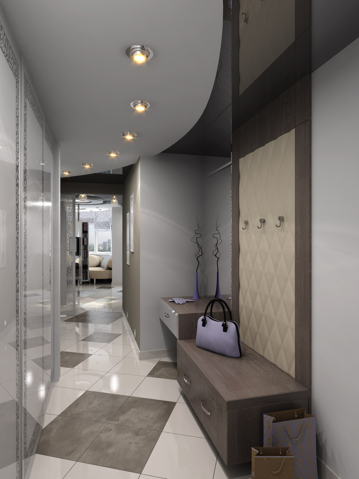 La plupart des appartements commencent par un long couloir adjacent à un petit espace à la porte d'entrée, conçu sous la forme d'un hall d'entrée. La première chose à laquelle les clients de l'appartement font attention est un bel intérieur. Loin du dernier rôle dans la perception est joué par le plafond tendu dans le couloir photo avec des projecteurs. Il n'est pas facile de choisir le design du plateau, en harmonie avec les murs et le sol, les meubles et les portes. Par conséquent, il est important de connaître les options de conception de base et les méthodes de combinaison.