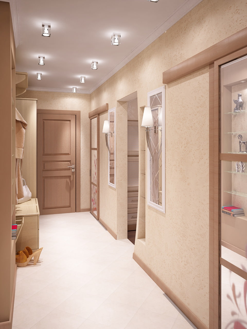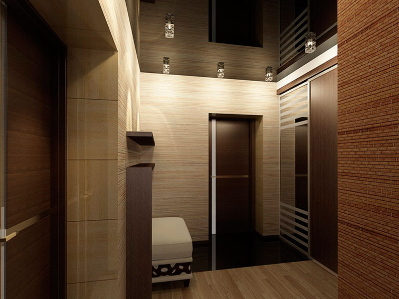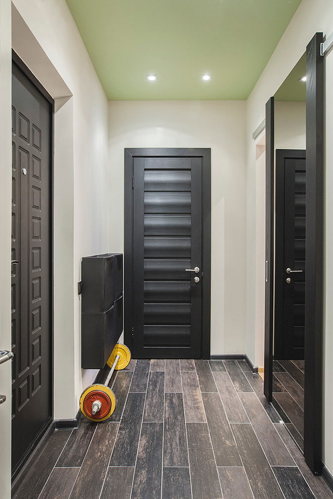 Avec des plafonds bas dans un couloir rectangulaire, le brillant peut être la seule bonne solution, comme dans l'exemple de la photo.