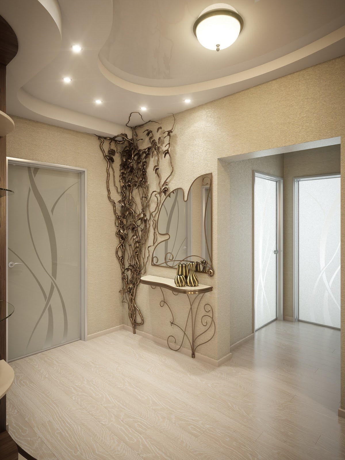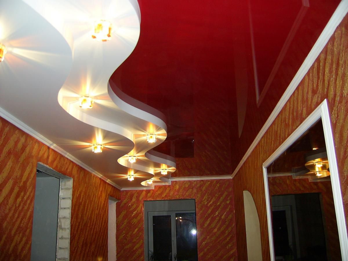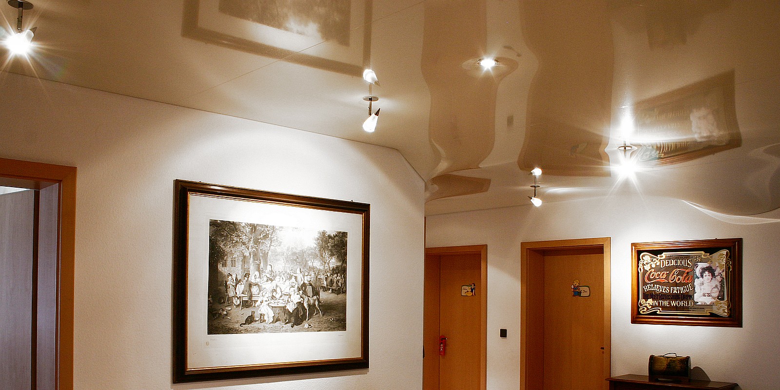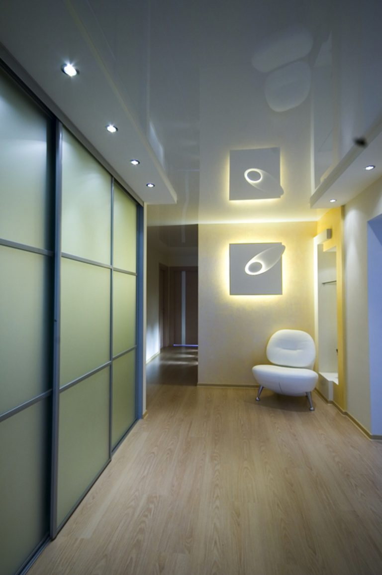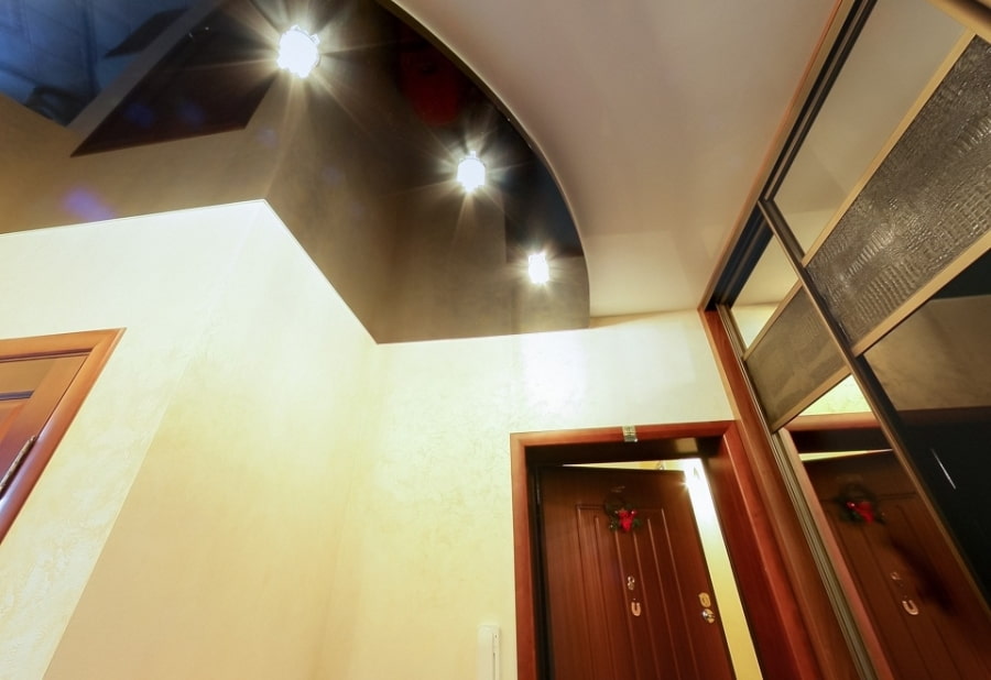 Attention! Dans les couloirs et le hall étroits, le brillant ne fera qu'augmenter les déséquilibres, rétrécissant visuellement les murs. Avec une géométrie d'espace complexe, la meilleure solution est un plafond brillant dans le couloir, mat ou satiné - dans les passerelles adjacentes.