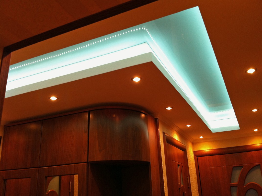 Comment moderniser un couloir étroit pour les propriétaires de l'ancien Khrouchtchev? Il convient de privilégier les plafonds avec éclairage à diodes.Beaucoup sont habitués aux classiques, et la conception d'éclairage avec "stretch" soulève des questions. La solution moderne est une bande de diodes, un chaos lumineux ou une série de points uniques, selon le concept de conception.
