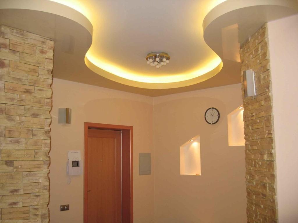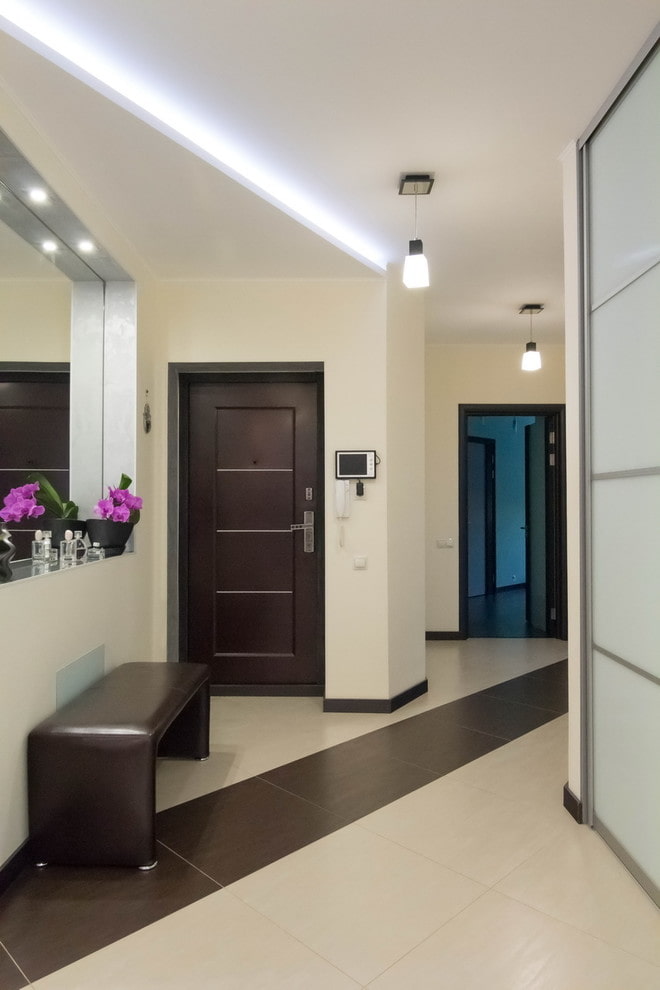 Les revêtements de tension sont le meilleur moyen de moderniser un appartement dans une maison ancienne. Le point culminant de la conception de la pièce à la porte d'entrée est une conception d'éclairage réfléchie, comme dans l'exemple illustré.