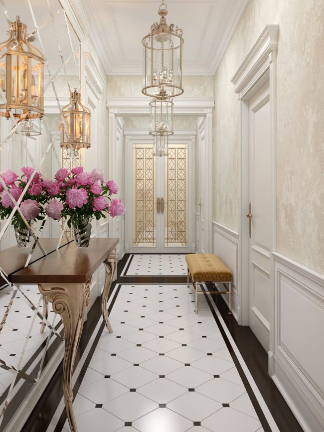 Les couloirs en noir et blanc peuvent jouer d'une manière complètement nouvelle et transformer un petit couloir en une pièce confortable et élégante.