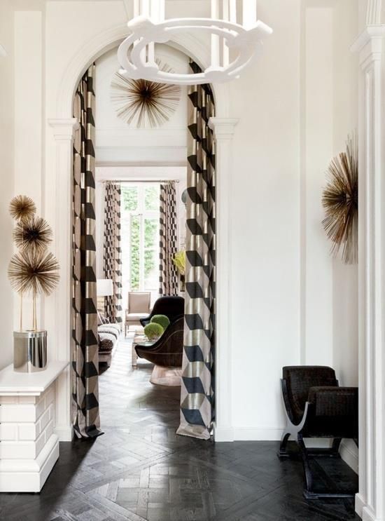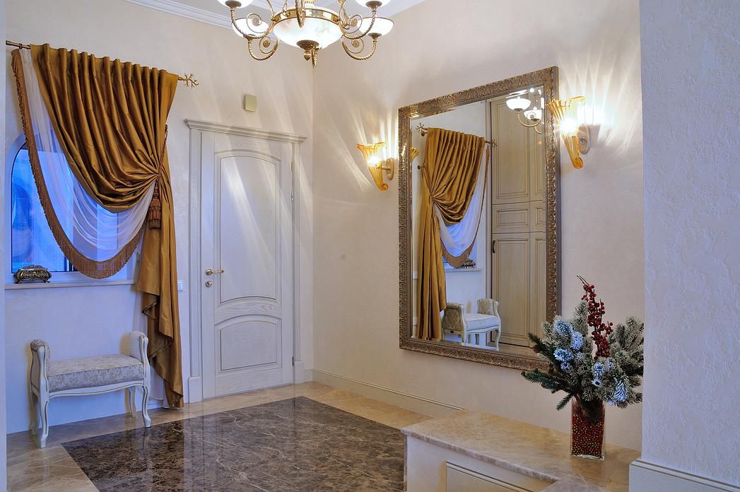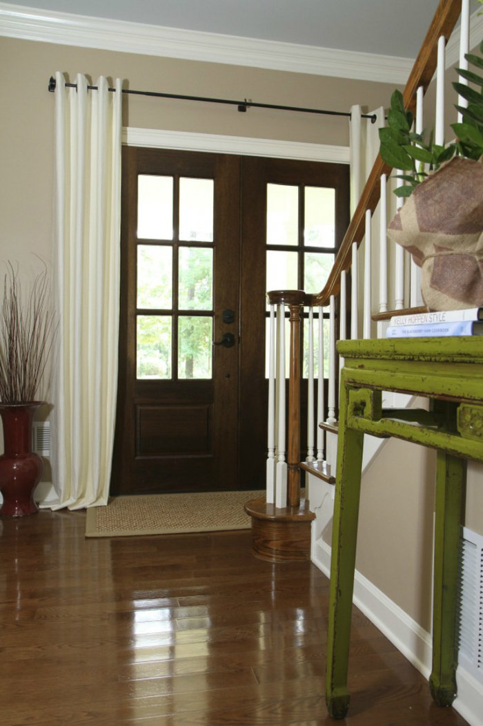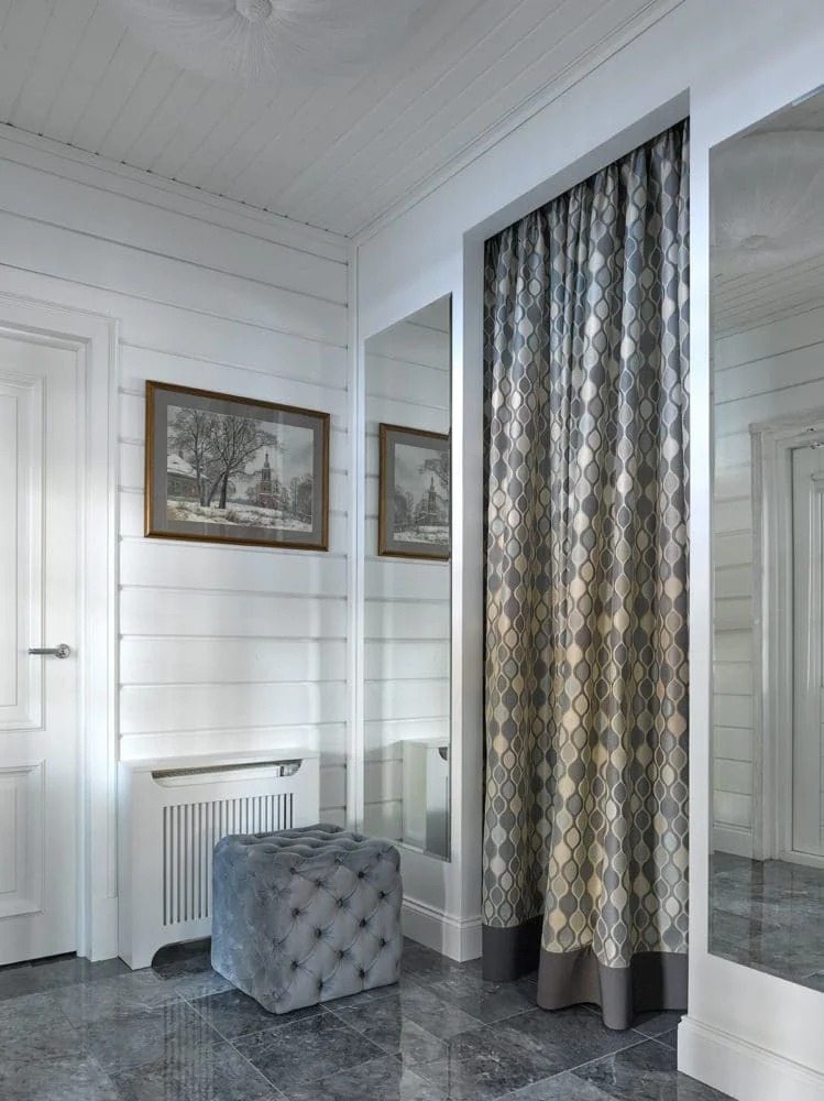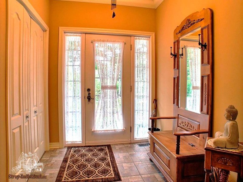 Conception d'un hall d'entrée dans une maison privée: choix de rideaux pour portes et fenêtres. Sélection de photos