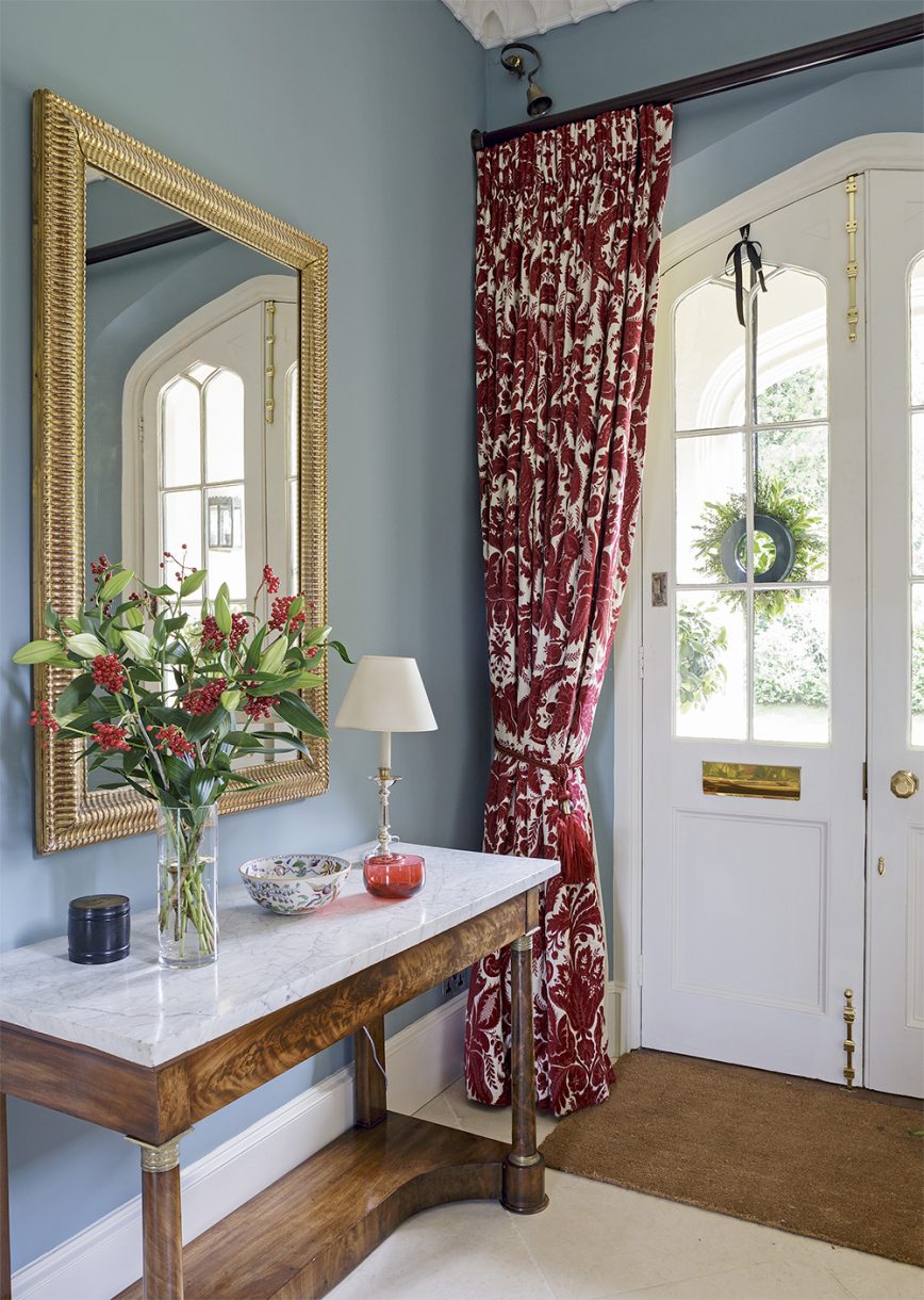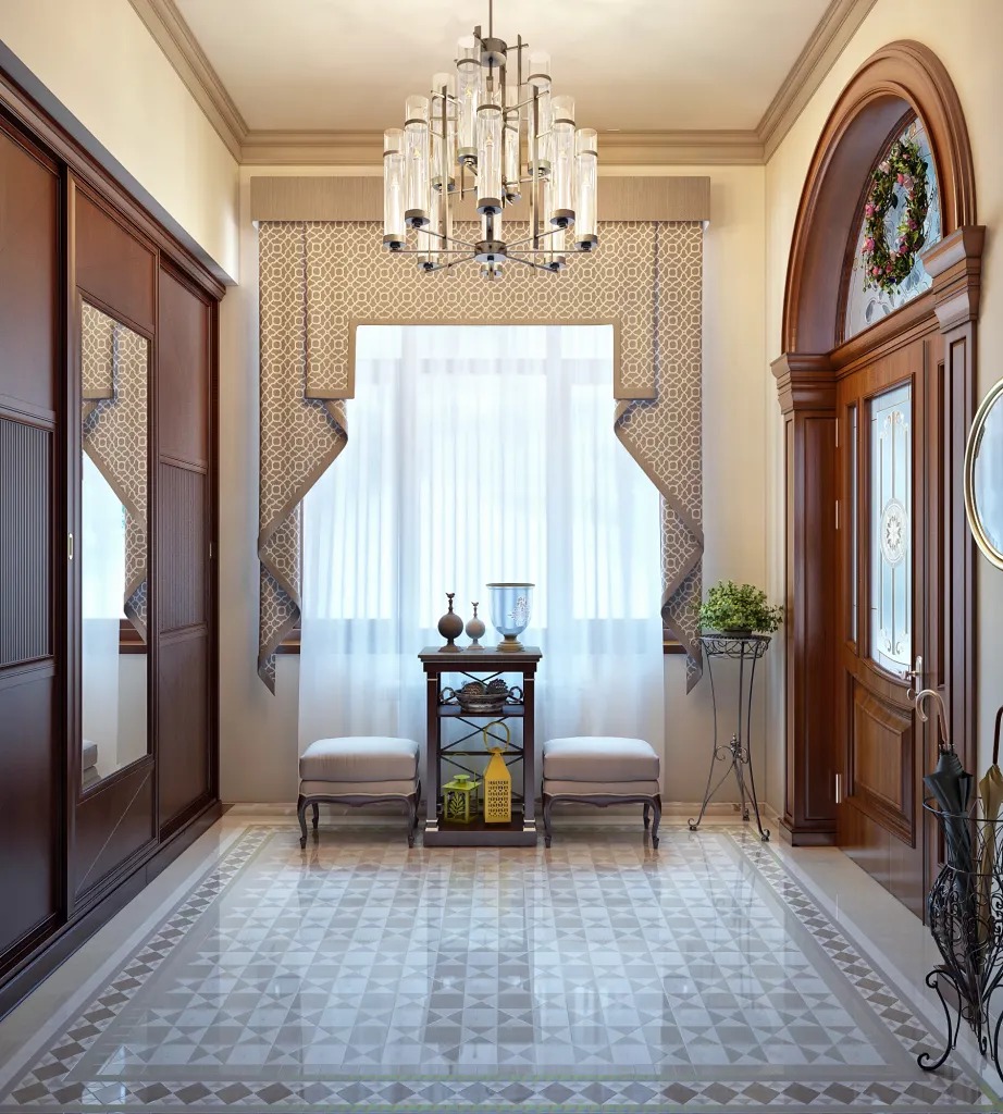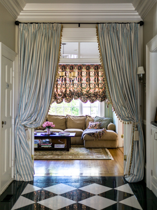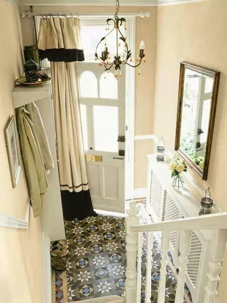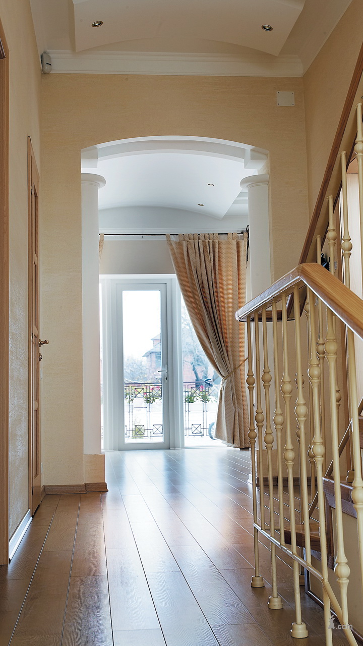 Conception d'un hall d'entrée dans une maison privée: choix de rideaux pour portes et fenêtres. Sélection de photos