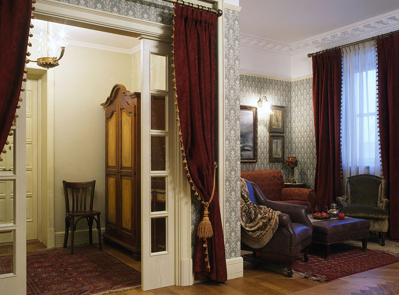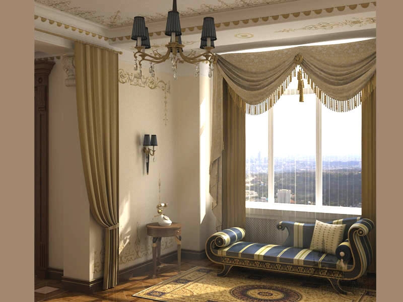 Pour les grandes pièces, les rideaux peuvent être faits de tissus lourds et coûteux.