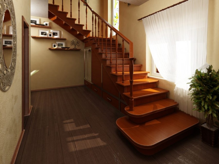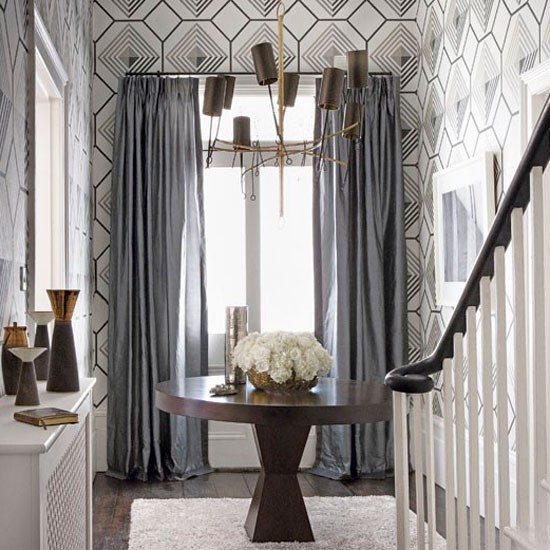 Pour les couloirs étroits, la meilleure solution est des rideaux à motif horizontal.