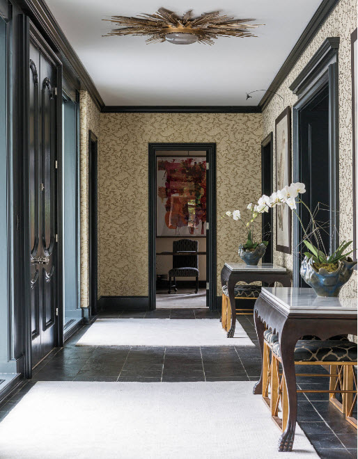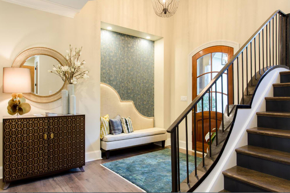 Puisque les classiques sont toujours synonymes des mots «luxe» et «sophistication», il est agréable d'ajouter des éléments en stuc et de la dorure à la décoration. Cela peut se manifester dans la décoration des plinthes de plafond ou simplement des éléments décoratifs. Par exemple, un miroir dans un cadre doré est le complément parfait d'un hall d'entrée de style néoclassique. Au fait, si la taille du couloir le permet, n'hésitez pas à y «installer» un lustre en cristal. Le classique permet ce mouvement audacieux.