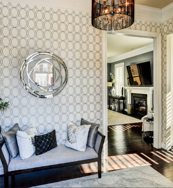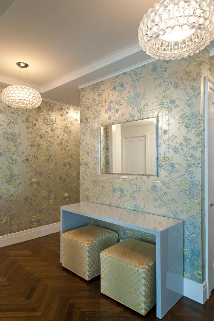 Important! Les papiers peints à paillettes sont un choix digne pour les néoclassicistes. Ceux-ci peuvent être des options monophoniques avec un léger éclat, ou avec un motif dans lequel seuls certains éléments brillent. Argent ou doré, il doit être en harmonie avec d'autres détails brillants: garniture de meuble, poignées d'armoires ou chandeliers (le cas échéant).