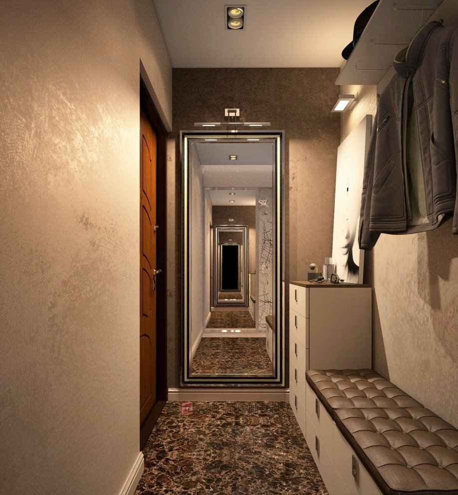 - Installez des miroirs dans le couloir, utilisez plus de matériaux avec une surface brillante et réfléchissante. Leur réflectivité augmente visuellement l'espace.
