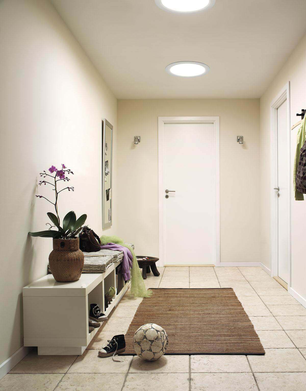 Pour rendre les processus de rassemblement avant la sortie plus confortables et la perception visuelle de la pièce plus agréable, vous pouvez utiliser un éclairage ponctuel. Pour un long couloir, c'est la solution parfaite. Si vous installez plusieurs lampes LED qui peuvent être montées dans un plafond suspendu sur toute la longueur de la pièce, l'éclairage sera uniforme et donnera également un niveau de luminosité suffisant.
