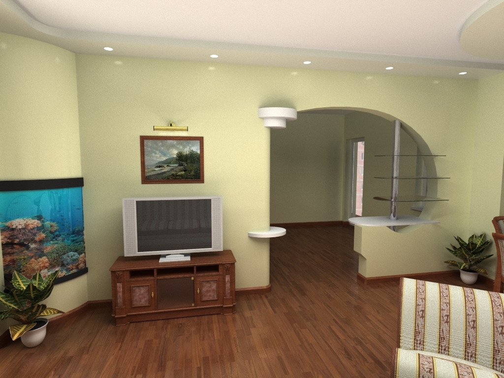 - Zonage. Le salon est facilement séparé du couloir en érigeant des arcs en plaques de plâtre dans le couloir, laissant une sensation d'un seul espace et formant deux zones différentes.