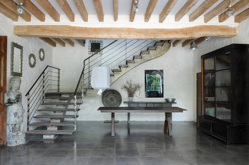 Pierre naturelle et bois naturel dans le hall d'entrée dans l'esprit du moyen-âge français