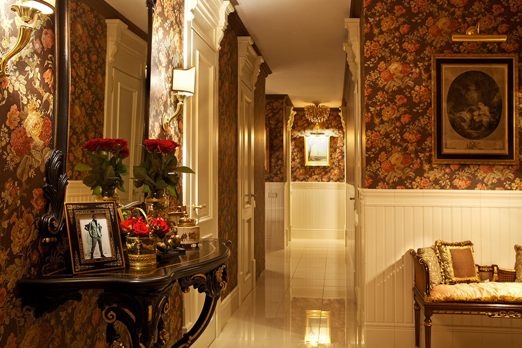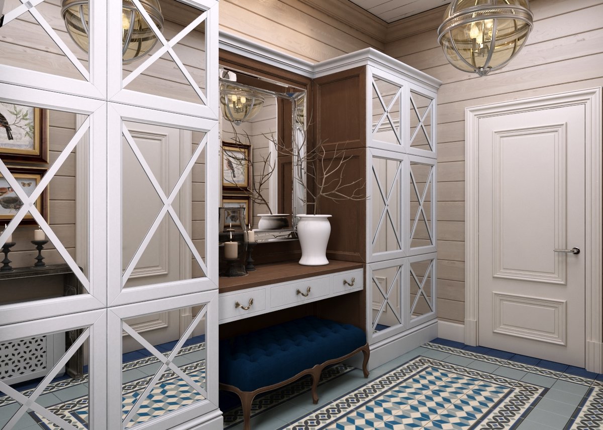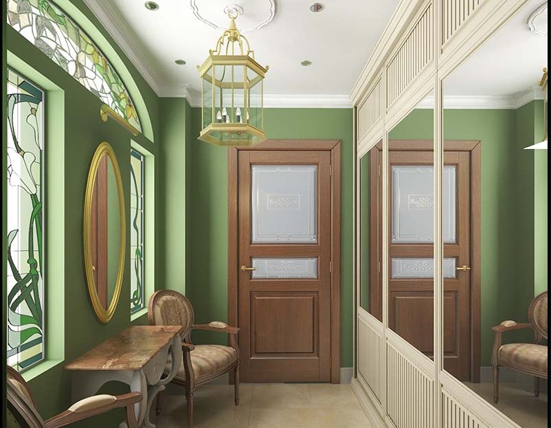 Un «compagnon» obligatoire d'un tel hall d'entrée est un grand miroir dans un cadre massif, «accompagné» de meubles en bois avec des sculptures et des tissus d'ameublement coûteux. Les lampes forgées et les figurines antiques complèteront de manière appropriée l'image globale.