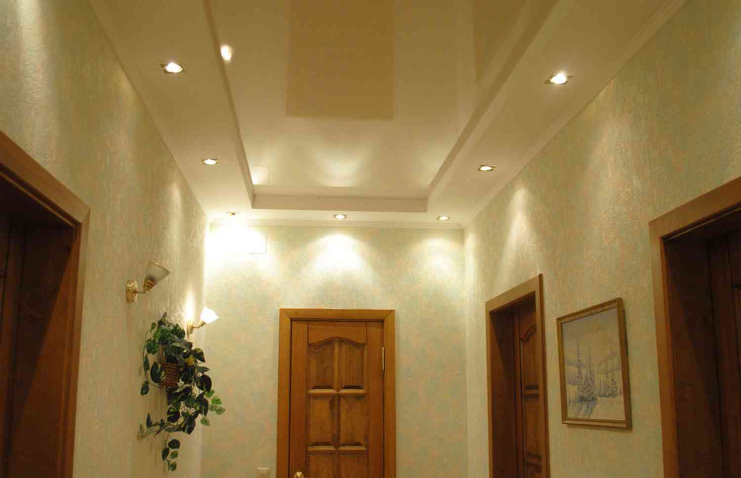 Un plafond suspendu peut transformer la pièce la plus ordinaire en une pièce élégante. Il peut être simple ou à plusieurs niveaux. Cette conception vous permet de positionner efficacement les luminaires. Le seul inconvénient est que le plafond suspendu «vole» l'espace, ce qui signifie qu'il est inapproprié dans les petits couloirs non standard d'une maison privée.