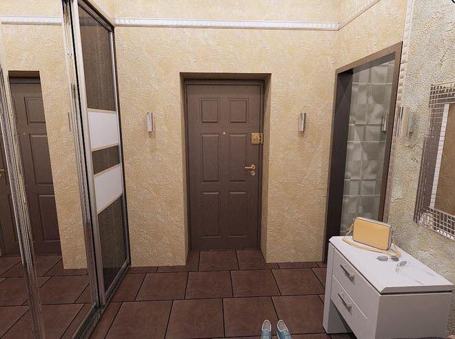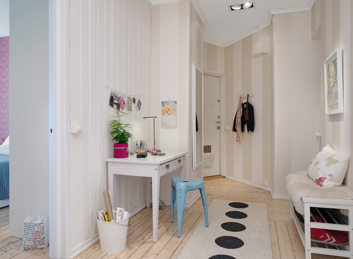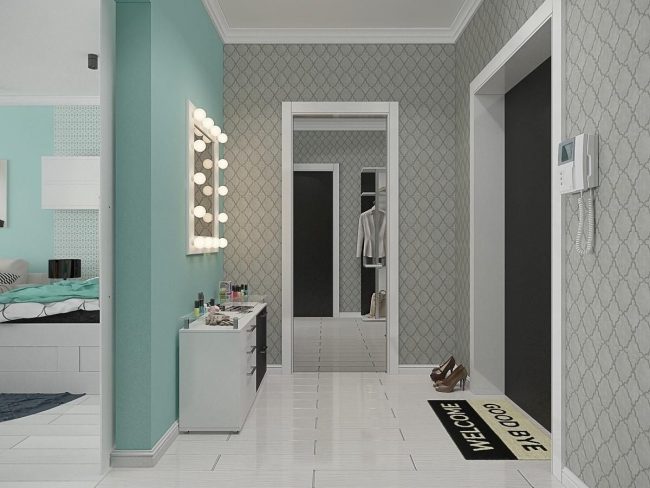 - Un petit couloir aura fière allure dans des couleurs pastel. Vous pouvez le diversifier en choisissant un motif sous forme de formes géométriques. Les miroirs ajouteront de la lumière, et si vous devez séparer le couloir de la pièce la plus proche, utilisez des portes coulissantes translucides.