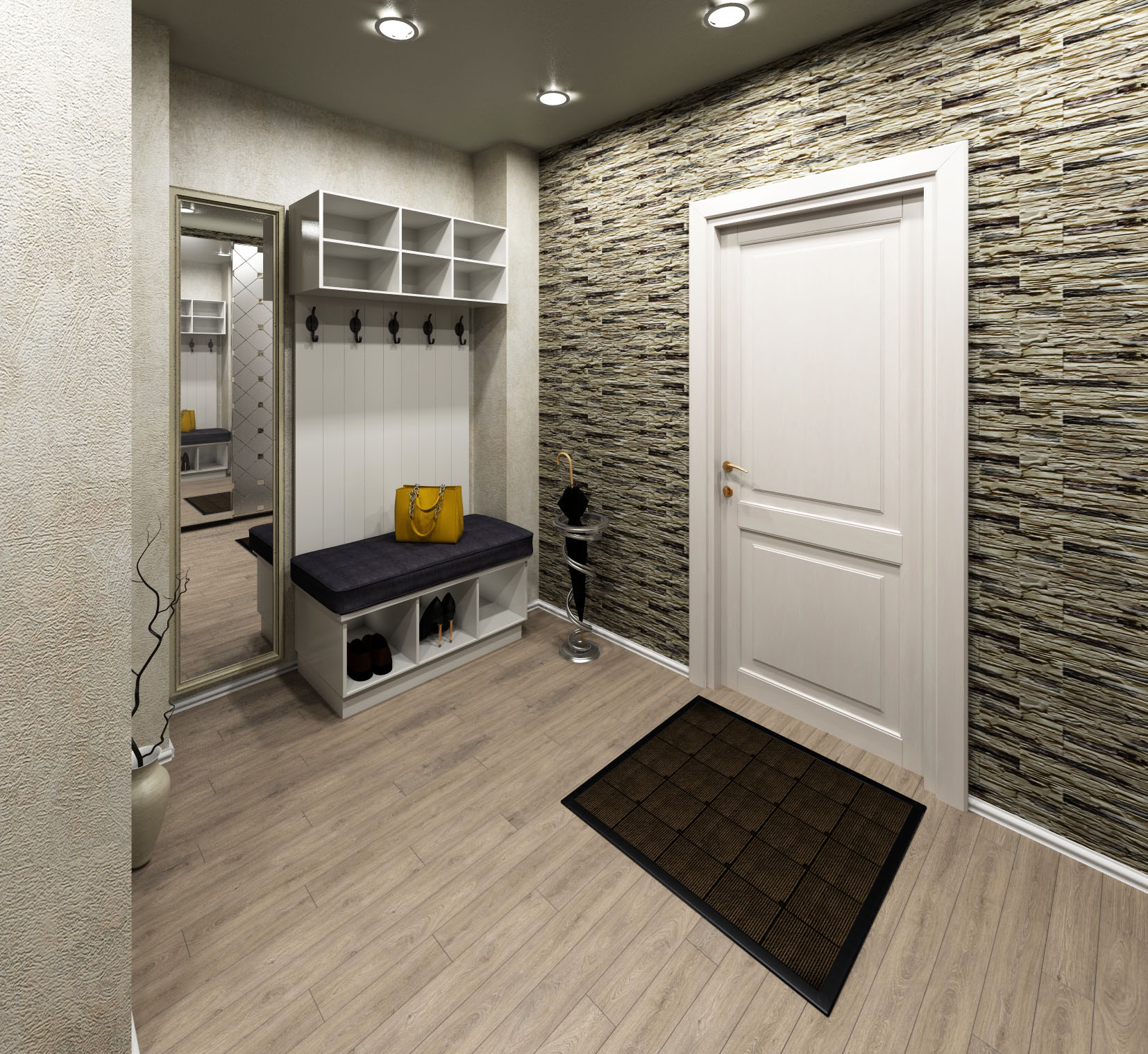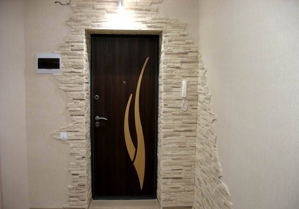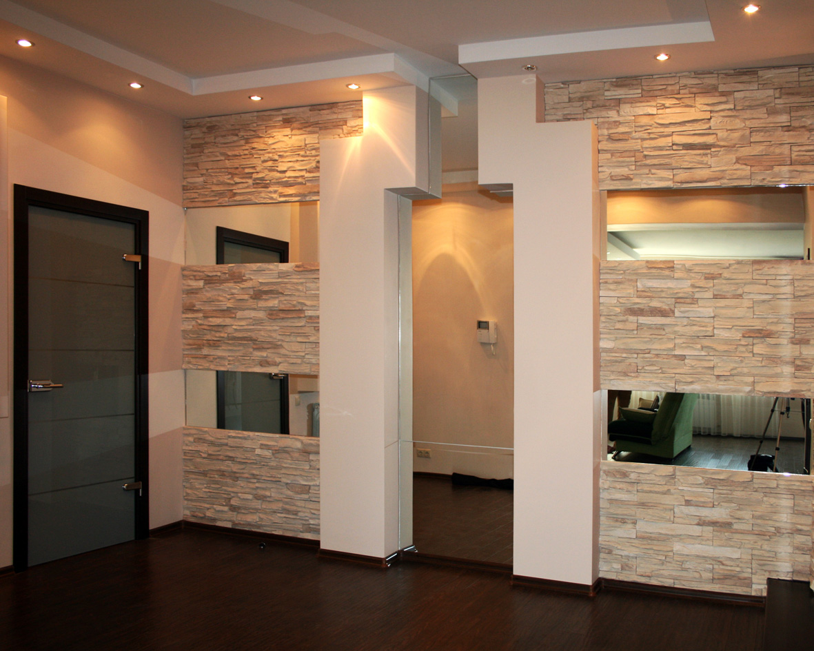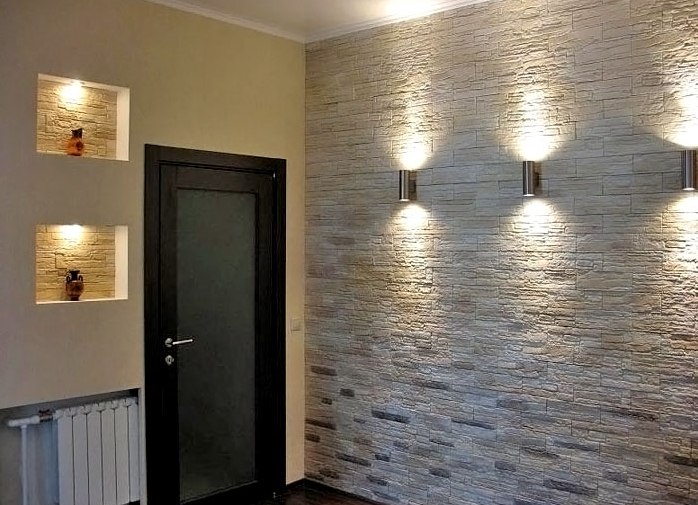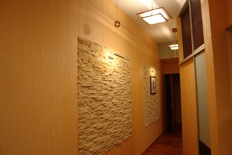 Décorer l'intérieur du couloir avec une pierre semble riche et élégant. Les concepteurs conseillent de choisir un matériau non naturel, mais artificiel pour la décoration murale. Il coûte beaucoup moins cher, mais en fait, il est plus solide et résiste mieux aux températures extrêmes.