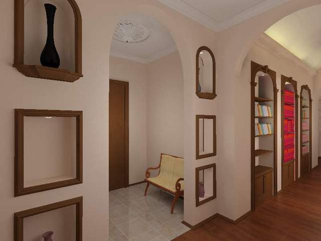 - Zone un long couloir avec des meubles, des arcs ou des poutres au plafond. Les meubles sont mieux de ne pas s'entasser, choisissez des options modestes dans des couleurs vives.