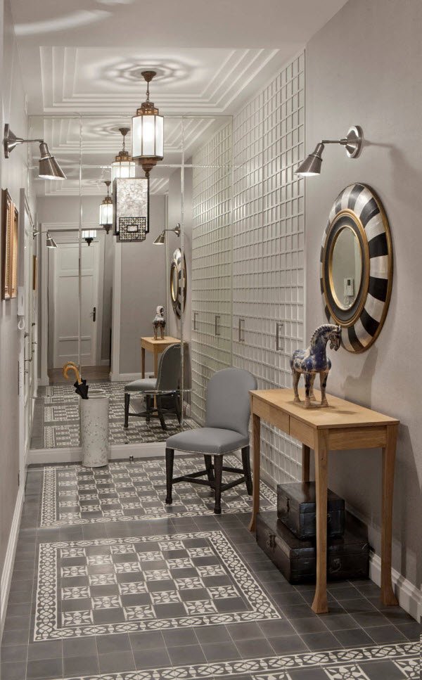 Faites attention! Pour agrandir visuellement l'espace, des astuces sont utilisées. Les ouvertures sont mieux conçues sous la forme d'un arc, et le long de l'allée, placez des bandes de miroir.